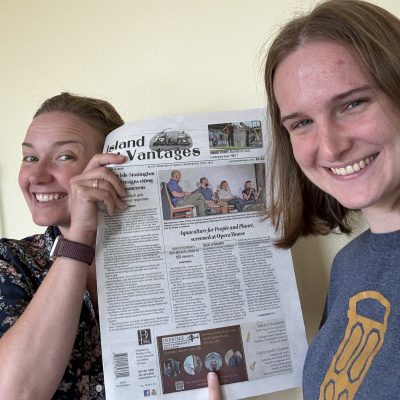 Meanwhile, Morgan and Grace were both excited to see the front page news story about Island Institute’s new Climate of Change film. Grace is currently the Deer Isle-Stonington Island Institute Fellow and, fun fact, Morgan was the first Fellow on Isle au Haut!Â